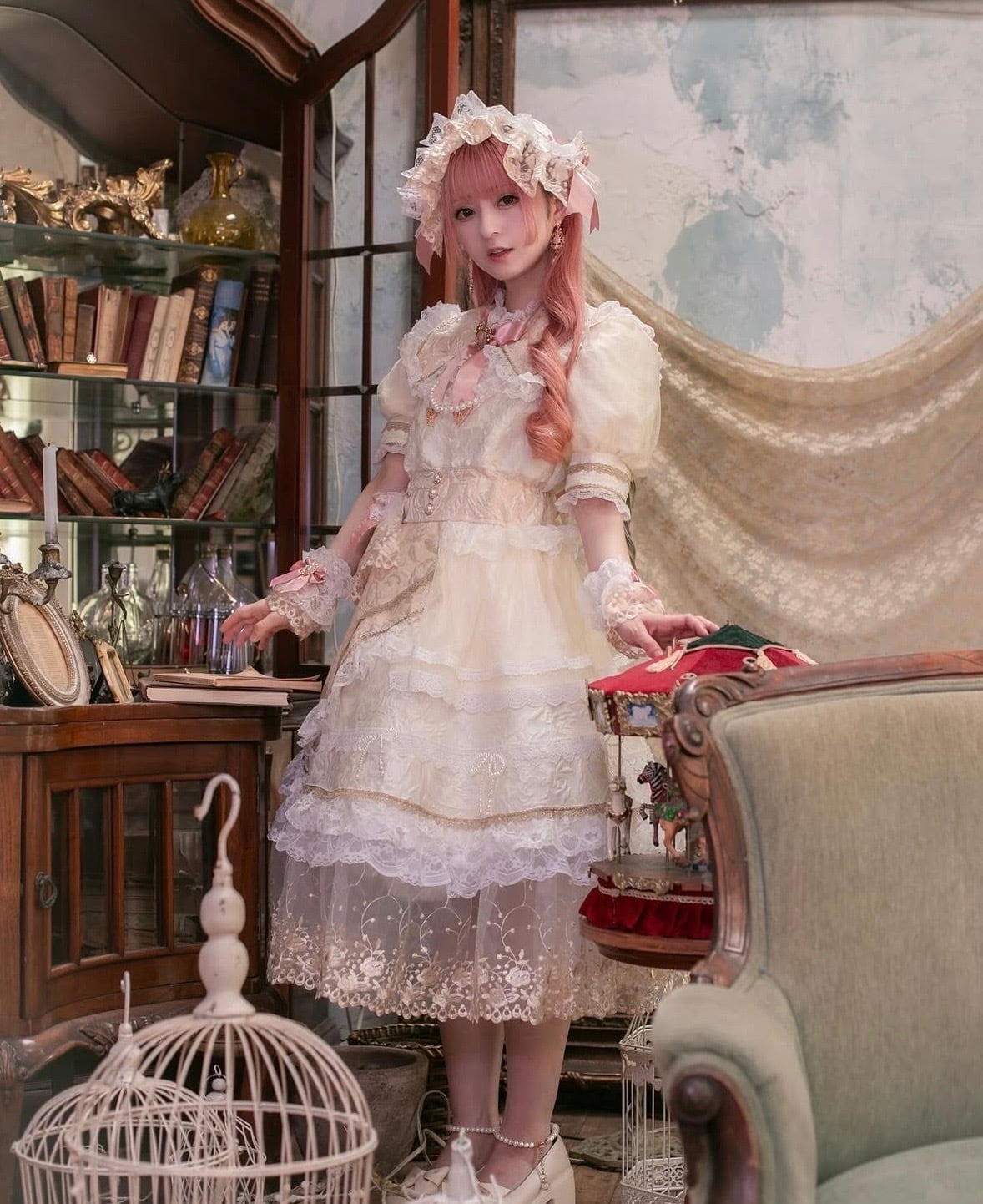 素材にこだわって製作した上品でかわいいロリータ衣装です。厚めの柄生地やジャガード生地にチュールを重ねて柔らかくもしっかりとした1着になっています。